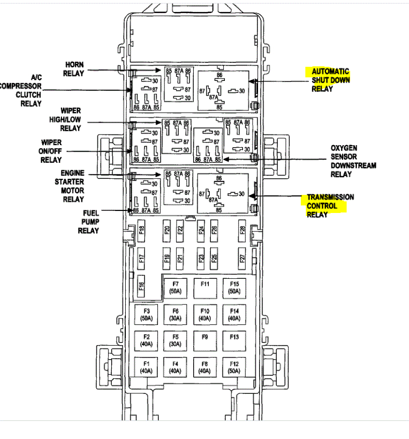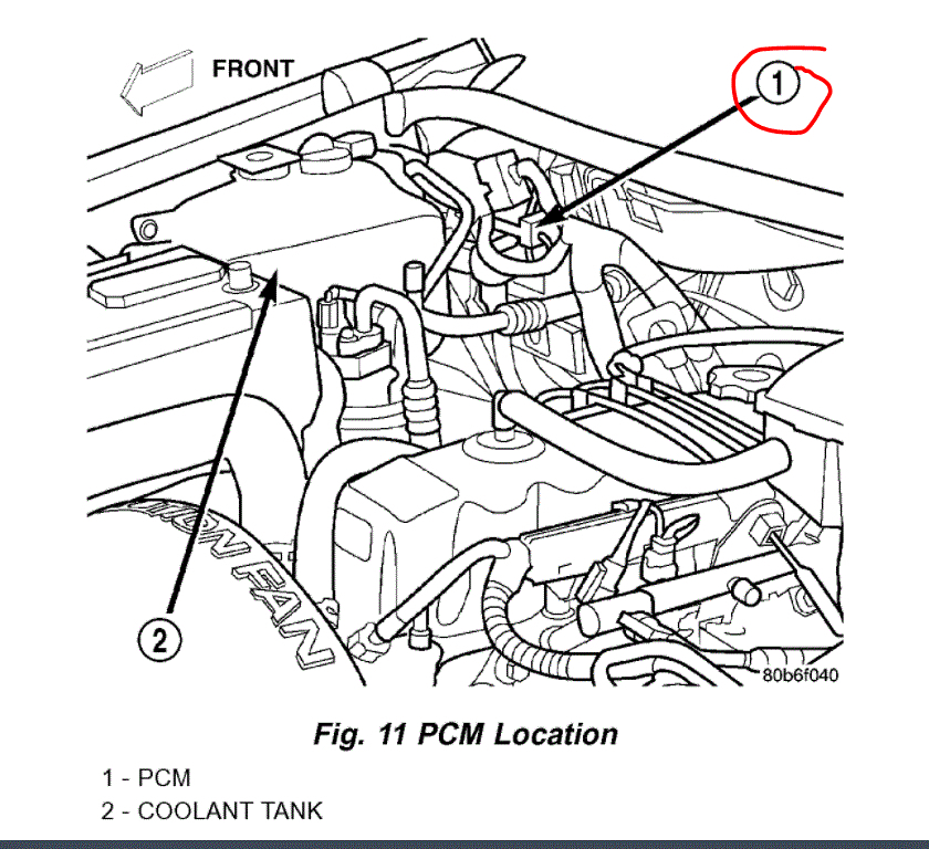 The PCM is next to the coolant overflow reservoir (see pic 1). Check to make sure nothing was disconnected, damaged, or loose. Also, I want you to check the auto shutdown relay (ASD) and the transmission control relay. Both are under the hood in the power distribution box. (see pic 2)