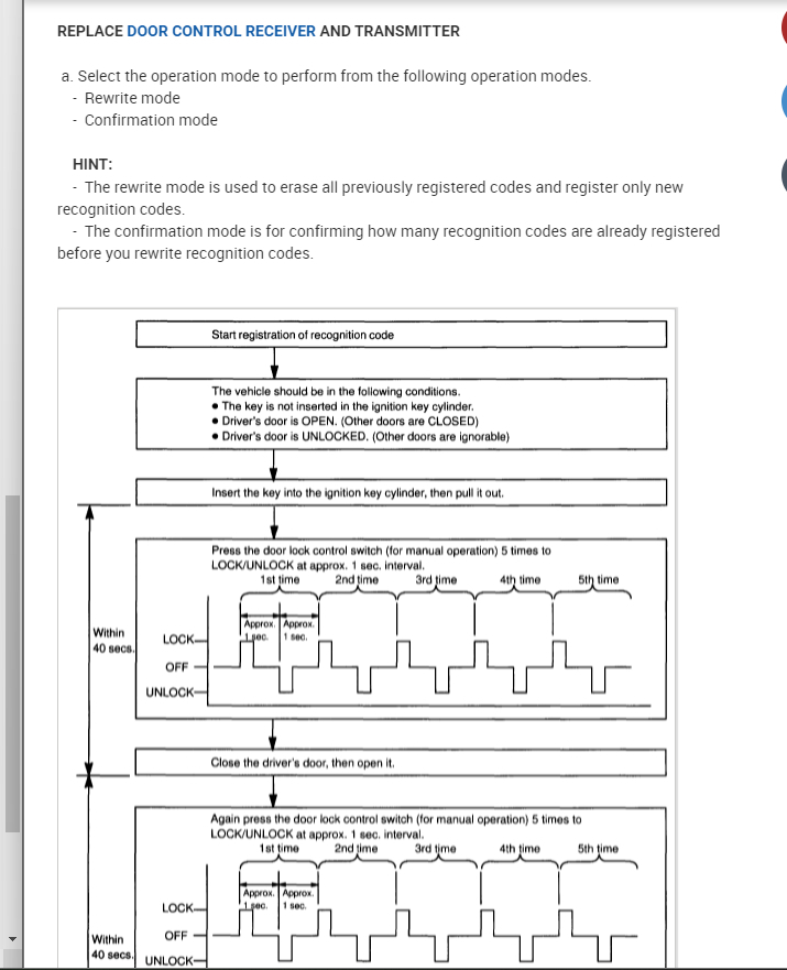I cannot get my car listed above to enter programming mode. I have tried the open/close door method as well as the lock/unlock five times approach. Neither seem to work. Next attempt will be to find the ECU and holding the reset button to pair my new key fob.