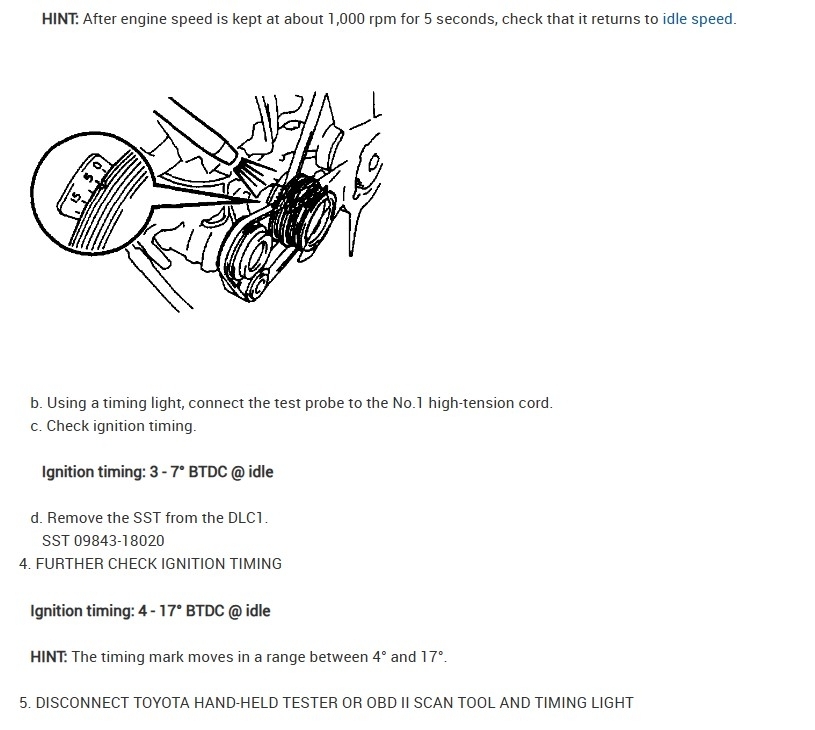 This is the spec and the pins to jump out to set Base Timing, once the timing is set, you can shut the engine off, remove the jumped pins, and the timing should advance by the ECM to the spec on the 5th diagram. 4-17* BTDC.