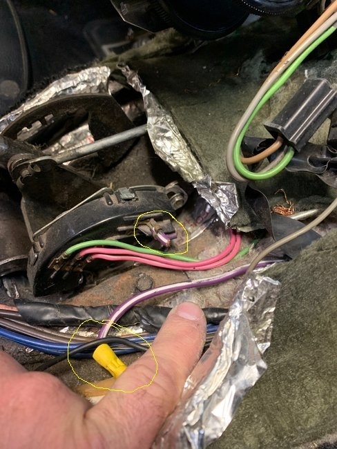 The two wires for the NSS are the same used for a clutch safety. One is purple with a white stripe, the other is a purple wire. They may be the ones in your first image with the yellow wire nut, next to the ones circled in yellow on the shifter that are cut short. I included the 75 wiring diagram.