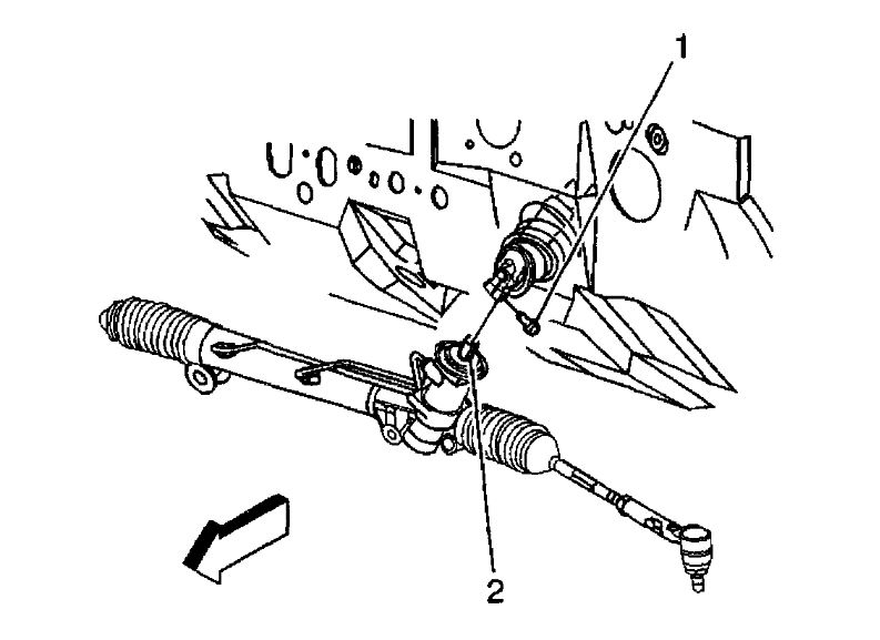 5. Remove the intermediate shaft lower pinch bolt (1) from the power steering gear (2).