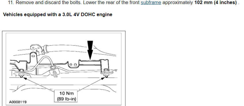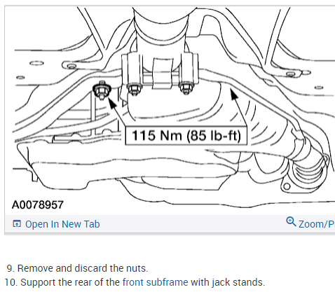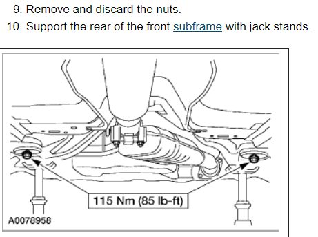 17.Support the rear of the front subframe with jack stands. 18.Remove and DISCARD the bolts. Lower the rear of the front subframe approximately 4" (102 mm).