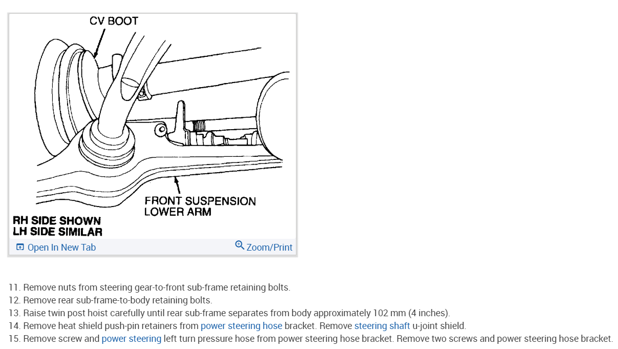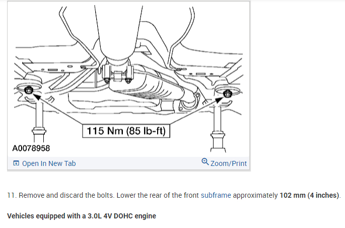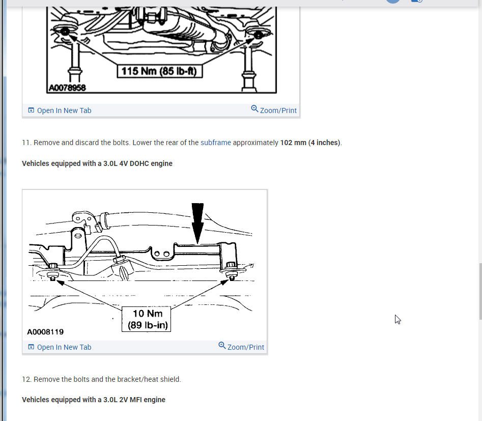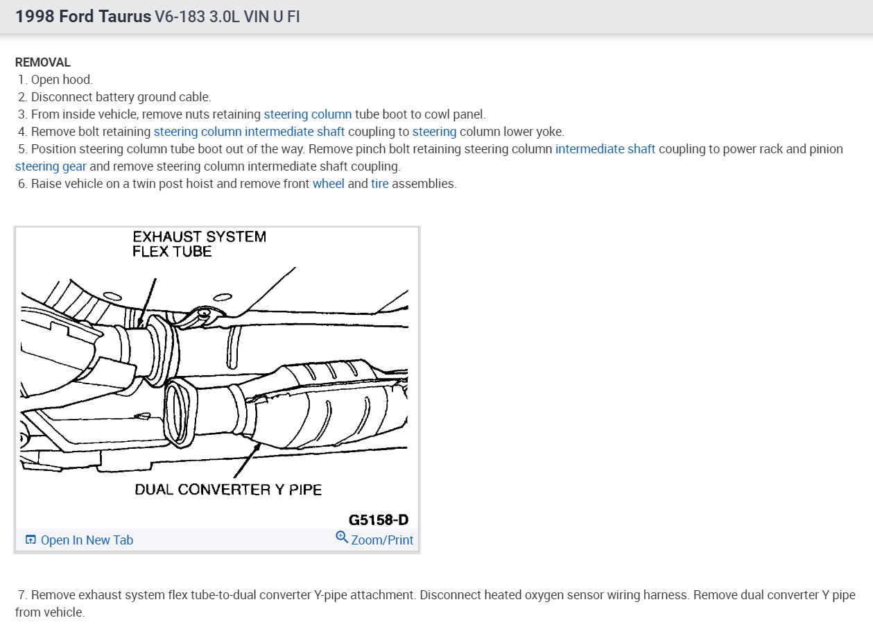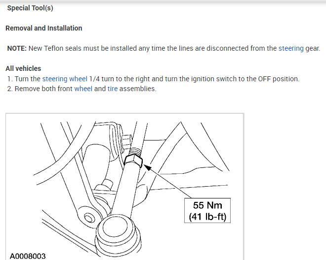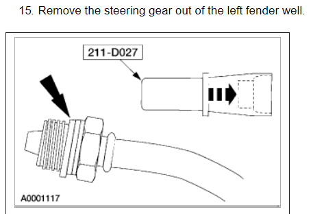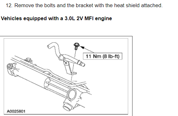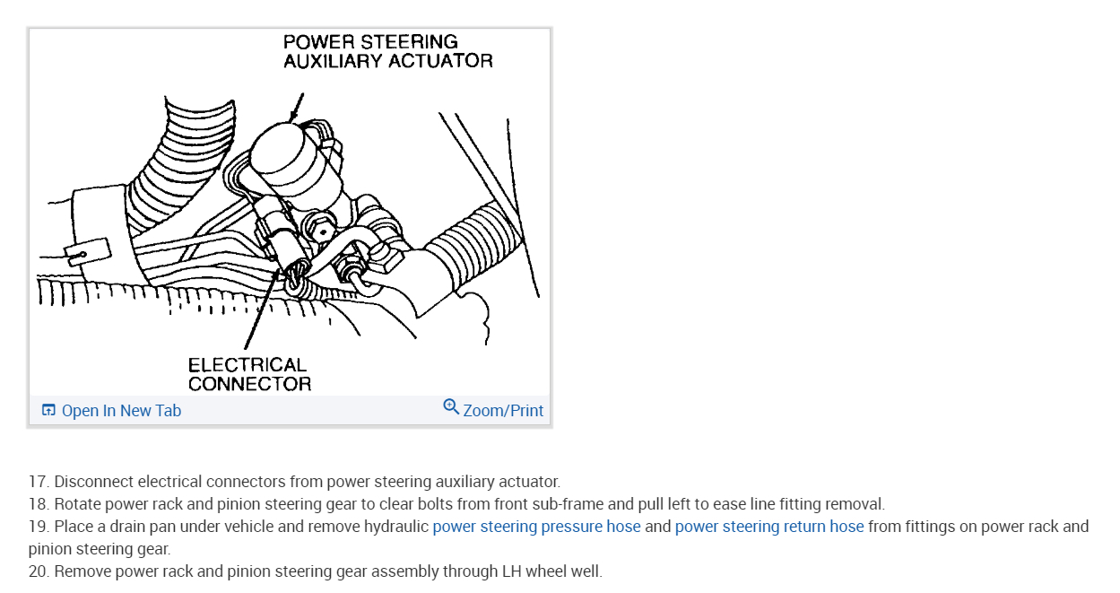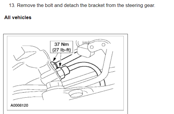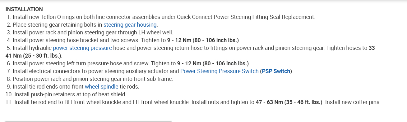 Per Jeremy at Village center care. Here is a faster procedure to R&R rack & save you guys alot of headaches. Y-pipe doesn't need to be removed as per procedure. The right rack bolt has a 24mm nut above the Y-pipe, but can easily be removed with use of 24mm gear wrench. Next loosen but don't remove right rear sub-frame bolt. Now loosen & remove left sub-frame bolt. This will open things up on the left side for removal. No need to unhook column on the inside, it can be accessed by lifting the boot on the firewall & remove pinch bolt(10mm) throught the left fender well. No need to unhook left swaybar link either. Next from above remove air intake to gain access down to steering lines. With the subframe lowered the rack will slide out the drivers side with ease. Total time to R&R should be cut in half by going this route. Good Luck out there guys.... By the book.. 1. Open hood. 2. Disconnect battery ground cable. 3. From inside vehicle, remove nuts retaining steering column tube boot to cowl panel. 4. Remove bolt retaining steering column intermediate shaft coupling to steering column lower yoke. 5. Position steering column tube boot out of the way. Remove pinch bolt retaining steering column intermediate shaft coupling to power rack and pinion steering gear and remove steering column intermediate shaft coupling. 6. Raise vehicle on a twin post hoist and remove front wheel and tire assemblies. 7. Remove exhaust system flex tube-to-dual converter Y-pipe attachment. See Fig. 32 . Disconnect heated oxygen sensor wiring harness. Remove dual converter Y pipe from vehicle. 8. Support vehicle with jack stands under rear edge of front sub-frame. See Fig. 33 . 9. Remove tie rod cotter pins and nuts, and remove tie rod end from right front wheel knuckle and left front wheel knuckle. 10. Remove tie rod end from front wheel spindle tie rod. Mark position of jam nut to maintain alignment. 11. Remove nuts from steering gear-to-front sub-frame retaining bolts. See Fig. 34 . 12. Remove rear sub-frame-to-body retaining bolts. 13. Raise twin post hoist carefully until rear sub-frame separates from body approximately 4" (102 mm). 14. Remove heat shield push-pin retainers from power steering hose bracket. Remove steering shaft U-joint shield. 15. Remove screw and power steering left turn pressure hose from power steering hose bracket. Remove two screws and power steering hose bracket. 16. Remove left stabilizer bar link. See Fig. 35 . 17. Disconnect power steering pressure switch electrical connector. 18. Rotate power rack and pinion steering gear to clear bolts from front sub-frame and pull left to ease line fitting removal. 19. Place a drain pan under vehicle and remove hydraulic power steering pressure hose and power steering return hose from fittings on power rack and pinion steering gear. 20. Remove power rack and pinion steering gear assembly through left wheel well. Installation 1. Install new Teflon(R) O-rings on both line connector assemblies. See HOSES . 2. Place steering gear retaining bolts in steering gear housing. 3. Install power rack and pinion steering gear through left wheel well. 4. Install power steering hose bracket and two screws. Tighten to specification. See TORQUE SPECIFICATIONS . 5. Install hydraulic power steering pressure hose and power steering return hose to fittings on power rack and pinion steering gear. Tighten hoses to specification. See TORQUE SPECIFICATIONS . 6. Install power steering pressure hose and screw. Tighten to specification. See TORQUE SPECIFICATIONS . 7. Connect power steering pressure switch electrical connector. 8. Position power rack and pinion steering gear into front sub-frame. 9. Install tie rod ends onto front wheel spindle tie rods. 10. Install push-pin retainers at top of heat shield. 11. Install tie rod end to right front wheel knuckle and left front wheel knuckle. Install nuts and tighten to specification. See TORQUE SPECIFICATIONS . Install new cotter pins. 12. Install left stabilizer bar link. See Fig. 35 . Tighten to specification. See TORQUE SPECIFICATIONS . 13. Lower hoist until rear sub-frame contacts body. 14. Install rear sub-frame retaining bolts. Tighten to specification. See TORQUE SPECIFICATIONS . 15. Install power rack and pinion steering gear-to-sub-frame nuts and tighten to specification. See TORQUE SPECIFICATIONS . 16. Install exhaust system flex tube to dual converter Y pipe. Connect heated oxygen sensor wiring harness. See Fig. 32 . 17. Install tire and wheel assemblies. 18. Remove jack stands and lower vehicle. 19. From inside vehicle, push steering column tube boot end out of vehicle and install over steering gear housing. 20. Install steering column intermediate shaft coupling to power rack and pinion steering gear. Tighten bolt to specification. See TORQUE SPECIFICATIONS . 21. Install inner steering column tube boot to cowl panel. 22. Install steering column intermediate shaft coupling to steering column lower yoke. See STEERING COLUMN article. 23. Fill power steering system with Motorcraft MERCON Multi -Purpose (ATF) Transmission Fluid XT-2-QDX or equivalent meeting Ford MERCON specification. See SYSTEM FILL under LUBRICATION. 24. Reconnect battery ground cable. 25. Bleed power steering system. See PURGING SYSTEM OF AIR under LUBRICATION. 26. Check system for leaks and proper operation. 6/16/2009