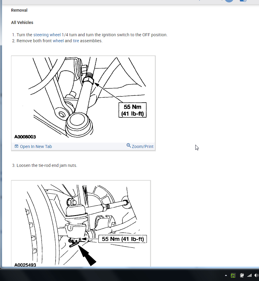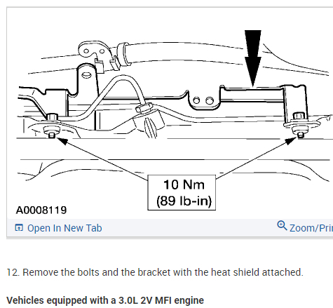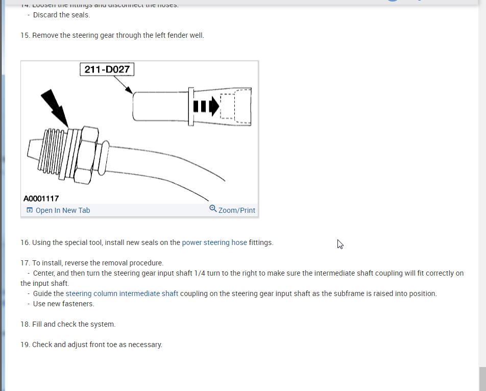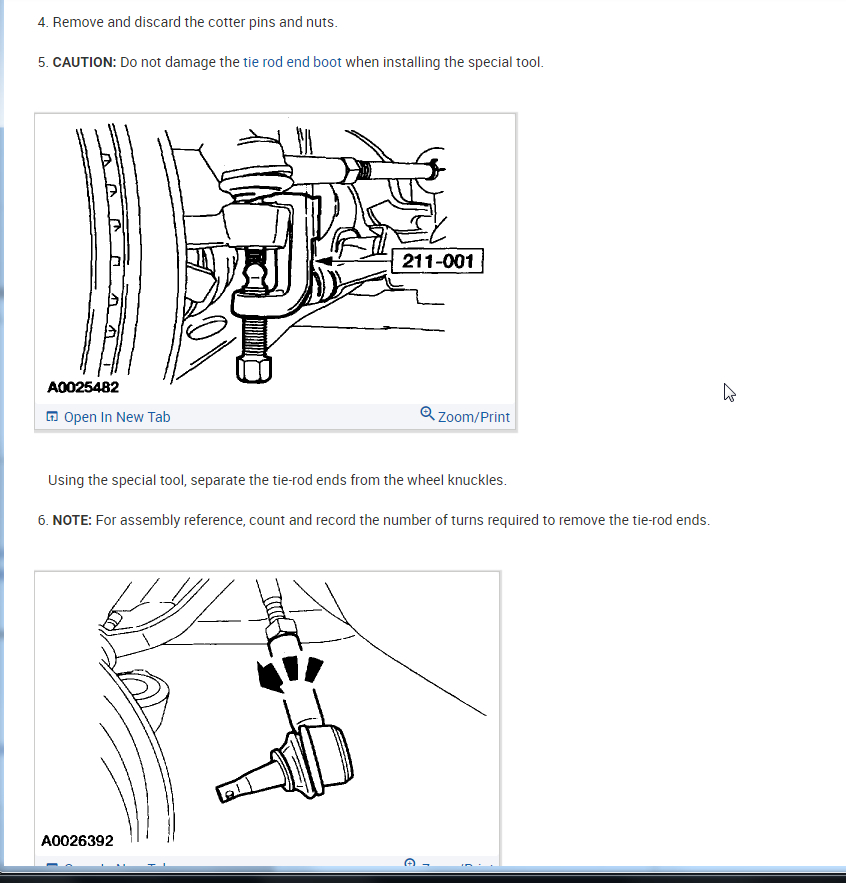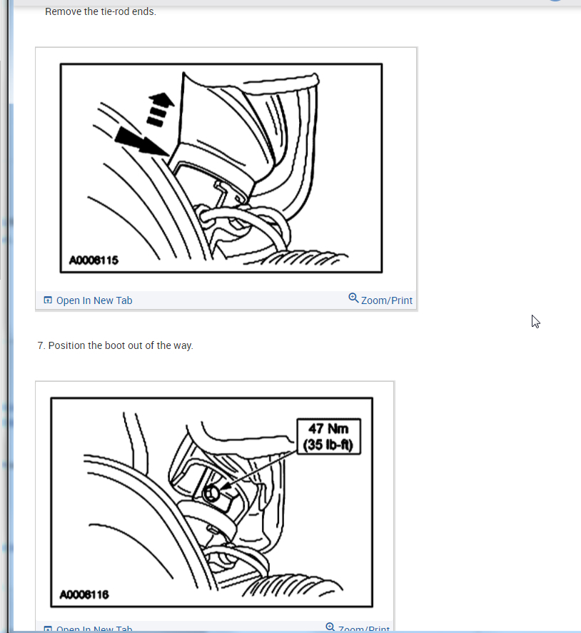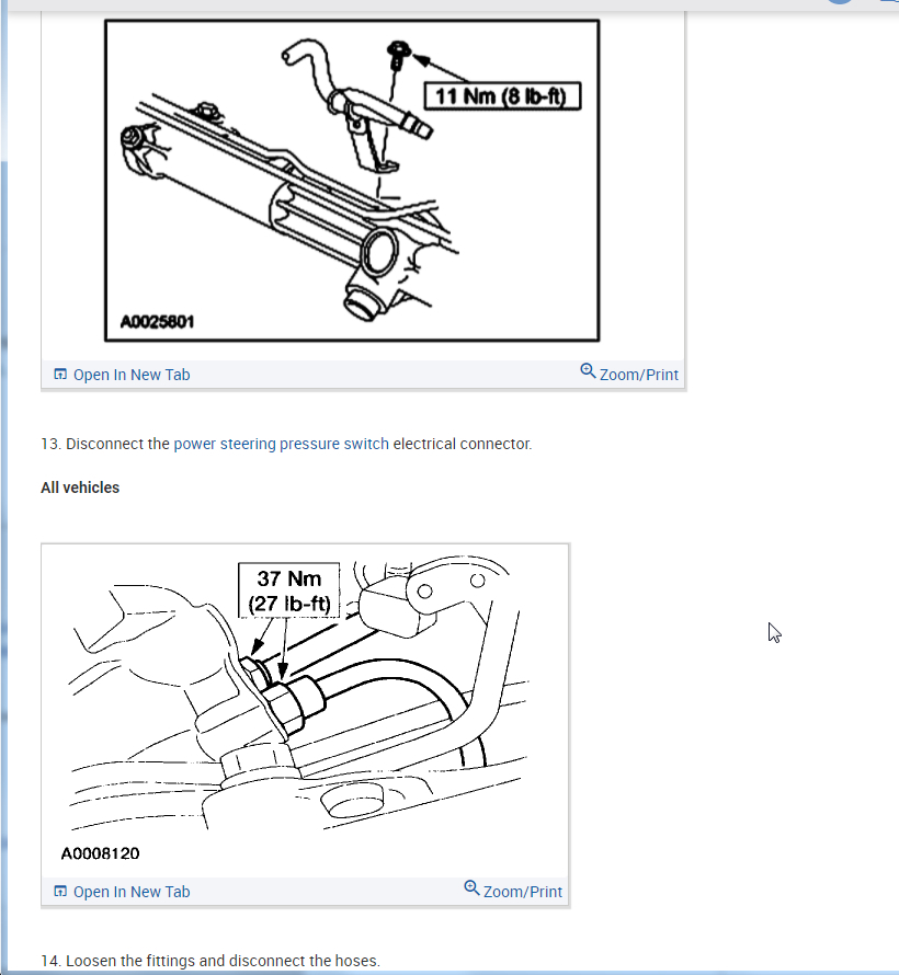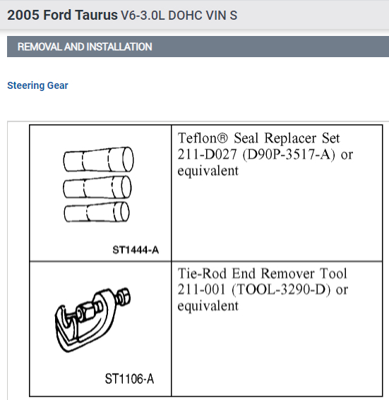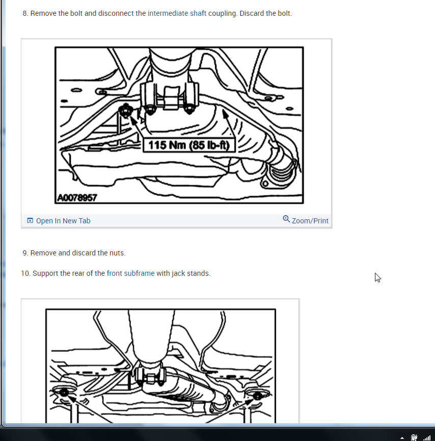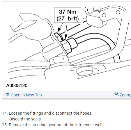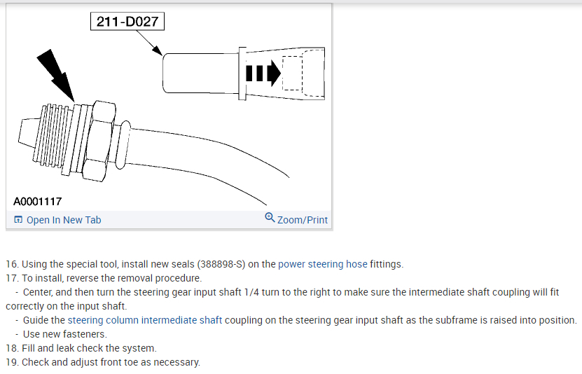 Per Jeremy at Village center care. Here is a faster procedure to R&R rack & save you guys alot of headaches. Y-pipe doesn't need to be removed as per procedure. The right rack bolt has a 24mm nut above the Y-pipe, but can easily be removed with use of 24mm gear wrench. Next loosen but don't remove right rear sub-frame bolt. Now loosen & remove left sub-frame bolt. This will open things up on the left side for removal. No need to unhook column on the inside, it can be accessed by lifting the boot on the firewall & remove pinch bolt(10mm) throught the left fender well. No need to unhook left swaybar link either. Next from above remove air intake to gain access down to steering lines. With the subframe lowered the rack will slide out the drivers side with ease. Total time to R&R should be cut in half by going this route. Good Luck out there guys.... By the book.. 1. Open hood. 2. Disconnect battery ground cable. 3. From inside vehicle, remove nuts retaining steering column tube boot to cowl panel. 4. Remove bolt retaining steering column intermediate shaft coupling to steering column lower yoke. 5. Position steering column tube boot out of the way. Remove pinch bolt retaining steering column intermediate shaft coupling to power rack and pinion steering gear and remove steering column intermediate shaft coupling. 6. Raise vehicle on a twin post hoist and remove front wheel and tire assemblies. 7. Remove exhaust system flex tube-to-dual converter Y-pipe attachment. See Fig. 32 . Disconnect heated oxygen sensor wiring harness. Remove dual converter Y pipe from vehicle. 8. Support vehicle with jack stands under rear edge of front sub-frame. See Fig. 33 . 9. Remove tie rod cotter pins and nuts, and remove tie rod end from right front wheel knuckle and left front wheel knuckle. 10. Remove tie rod end from front wheel spindle tie rod. Mark position of jam nut to maintain alignment. 11. Remove nuts from steering gear-to-front sub-frame retaining bolts. See Fig. 34 . 12. Remove rear sub-frame-to-body retaining bolts. 13. Raise twin post hoist carefully until rear sub-frame separates from body approximately 4" (102 mm). 14. Remove heat shield push-pin retainers from power steering hose bracket. Remove steering shaft U-joint shield. 15. Remove screw and power steering left turn pressure hose from power steering hose bracket. Remove two screws and power steering hose bracket. 16. Remove left stabilizer bar link. See Fig. 35 . 17. Disconnect power steering pressure switch electrical connector. 18. Rotate power rack and pinion steering gear to clear bolts from front sub-frame and pull left to ease line fitting removal. 19. Place a drain pan under vehicle and remove hydraulic power steering pressure hose and power steering return hose from fittings on power rack and pinion steering gear. 20. Remove power rack and pinion steering gear assembly through left wheel well. Installation 1. Install new Teflon(R) O-rings on both line connector assemblies. See HOSES . 2. Place steering gear retaining bolts in steering gear housing. 3. Install power rack and pinion steering gear through left wheel well. 4. Install power steering hose bracket and two screws. Tighten to specification. See TORQUE SPECIFICATIONS . 5. Install hydraulic power steering pressure hose and power steering return hose to fittings on power rack and pinion steering gear. Tighten hoses to specification. See TORQUE SPECIFICATIONS . 6. Install power steering pressure hose and screw. Tighten to specification. See TORQUE SPECIFICATIONS . 7. Connect power steering pressure switch electrical connector. 8. Position power rack and pinion steering gear into front sub-frame. 9. Install tie rod ends onto front wheel spindle tie rods. 10. Install push-pin retainers at top of heat shield. 11. Install tie rod end to right front wheel knuckle and left front wheel knuckle. Install nuts and tighten to specification. See TORQUE SPECIFICATIONS . Install new cotter pins. 12. Install left stabilizer bar link. See Fig. 35 . Tighten to specification. See TORQUE SPECIFICATIONS . 13. Lower hoist until rear sub-frame contacts body. 14. Install rear sub-frame retaining bolts. Tighten to specification. See TORQUE SPECIFICATIONS . 15. Install power rack and pinion steering gear-to-sub-frame nuts and tighten to specification. See TORQUE SPECIFICATIONS . 16. Install exhaust system flex tube to dual converter Y pipe. Connect heated oxygen sensor wiring harness. See Fig. 32 . 17. Install tire and wheel assemblies. 18. Remove jack stands and lower vehicle. 19. From inside vehicle, push steering column tube boot end out of vehicle and install over steering gear housing. 20. Install steering column intermediate shaft coupling to power rack and pinion steering gear. Tighten bolt to specification. See TORQUE SPECIFICATIONS . 21. Install inner steering column tube boot to cowl panel. 22. Install steering column intermediate shaft coupling to steering column lower yoke. See STEERING COLUMN article. 23. Fill power steering system with Motorcraft MERCON Multi -Purpose (ATF) Transmission Fluid XT-2-QDX or equivalent meeting Ford MERCON specification. See SYSTEM FILL under LUBRICATION. 24. Reconnect battery ground cable. 25. Bleed power steering system. See PURGING SYSTEM OF AIR under LUBRICATION. 26. Check system for leaks and proper operation. 6/16/2009