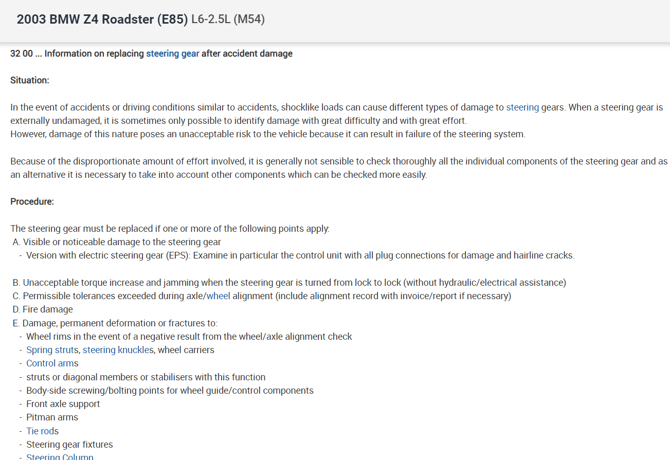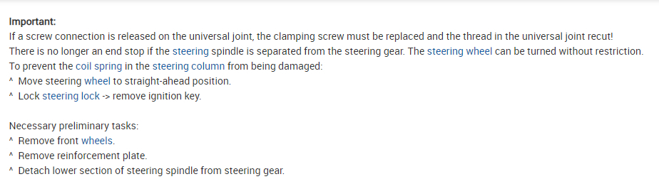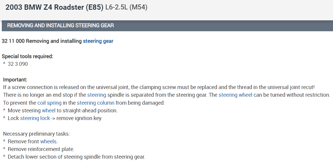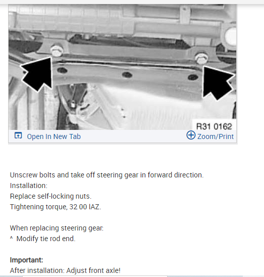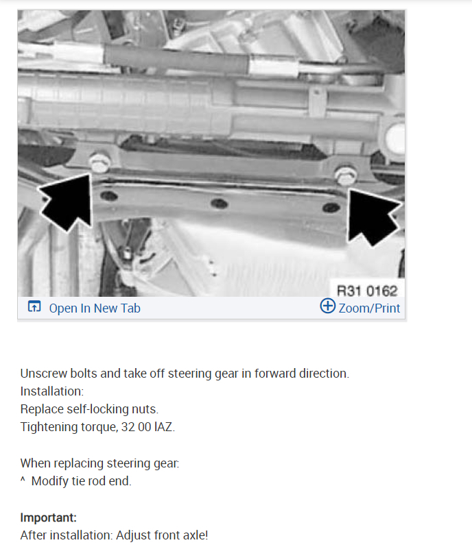 Just a note: (not listed in the directions). Disconnect the battery, lock the steering wheel in the straightforward position, do not allow the steering wheel to be turned while the rack is disconnected, bleed the new rack before starting the engine, the vehicle should be aligned after the repair is complete.