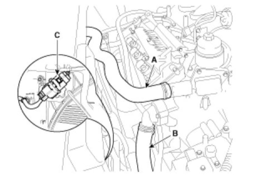 6. Remove the radiator upper hose (A), lower hose (B) and then disconnect the fan motor connector(C).