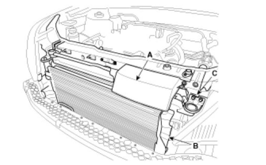 11. Remove the guard (B) and radiator mounting bracket (C).