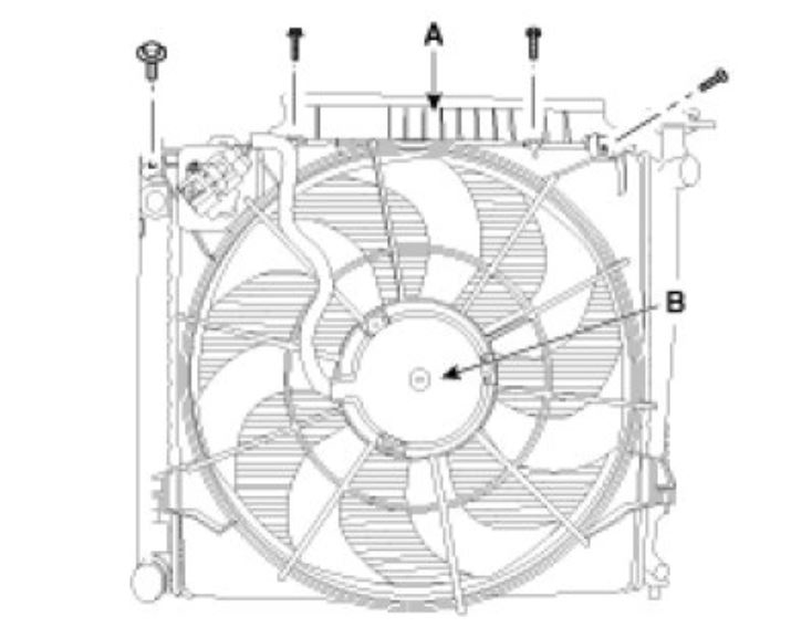 13. Separate the condenser from the radiator and then remove the upper cover (A) and cooling fan assembly (B).
