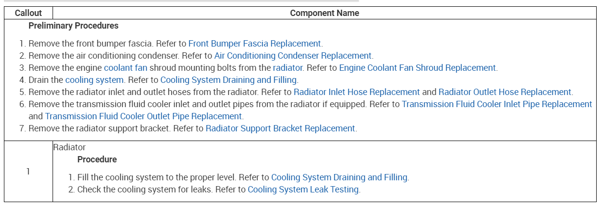 Radiator, R&R-- 3.8 hrs@ shop rate. This is because most of the front body/bumpers must be removed first. Check out the images (below). Please let us know if you need anything else to get the problem fixed.