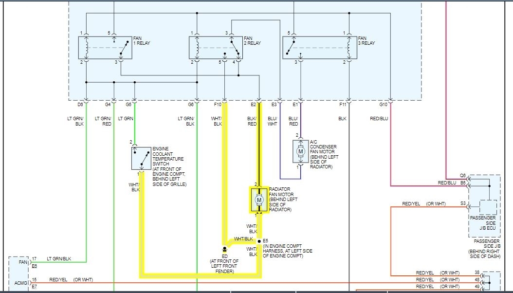 Since, the engine coolant switch, A/C single pressure switch and the engine coolant temperature sensor (from the circuit diagram) can complete the circuit for both fans to function. What is the function of fan relay 2?