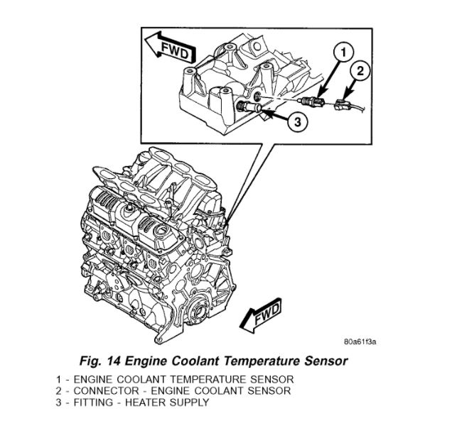 1. Install engine coolant temperature sensor (Fig. 14). Tighten sensor to 7 Nm (60 inch lbs.).