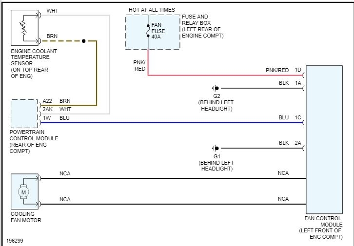 I would do some testing though just to be sure. It is a simple system as cooling fans go. The ECT sensor tell the PCM the temperature, at 209 degrees the PCM sends a pulsed power signal to the fan control module. That signal keeps getting faster as the temperature rises. The control module gets that signal and uses larger power transistors to pass the pulsed signal to the fan.
