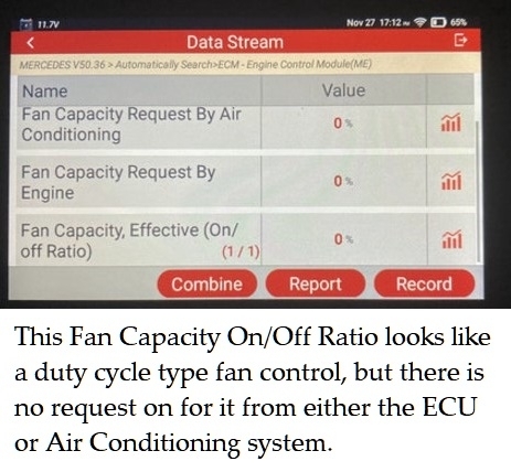 The fact that you may not even have the correct ECM now is going to make things more difficult, but the vehicle runs, this code B1102 (and I don't know if that code number is correct or not) regardless, it's the Instrument Cluster complaining that it cannot communicate with the ECM. It does say if it's a Current or Historic code, but the Instrument Cluster is on the "Engine" Can Bus network along with the ECM (ME-SFI) which makes sense, since it's the Fan running on high that is the complaint right now, but the rest of the communication codes could all be related,