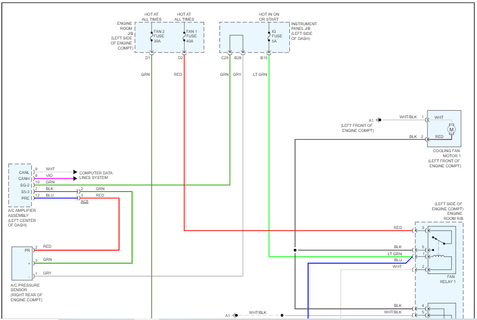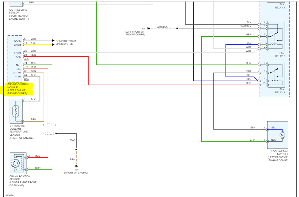I attached the wiring schematic below for the entire radiator cooling fan circuit. I had to cut it in half to make it readable but I did overlap them so you can follow from one to the next.