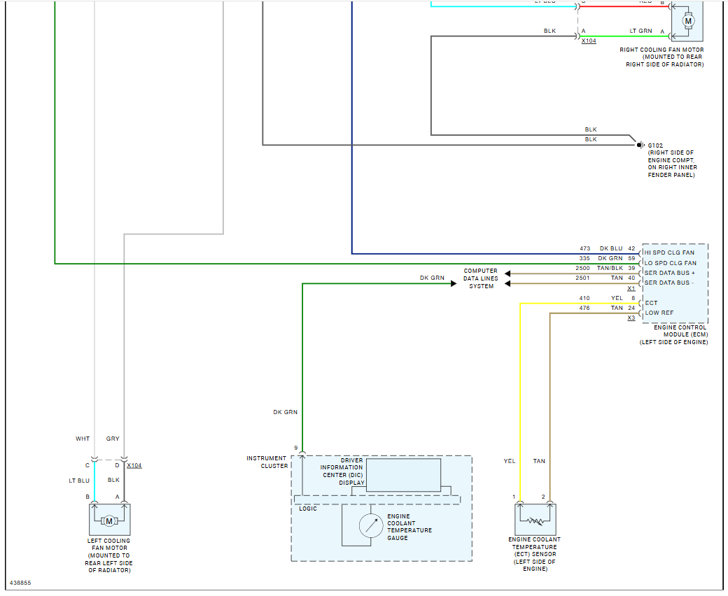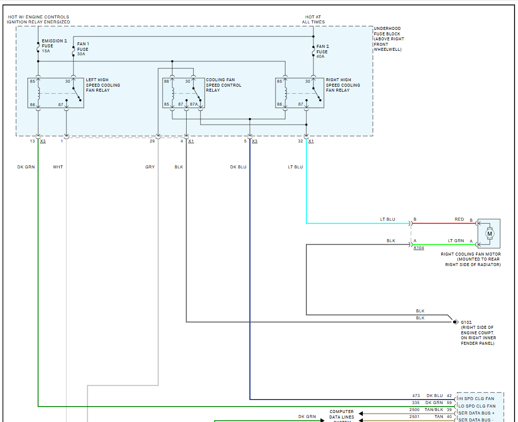 The system is not too complicated; I would check the g102 ground for the system which is located at the right side of the engine compartment on the right inner fender panel. Make sure the FAN1 and FAN2 fuses have power when the truck is running.