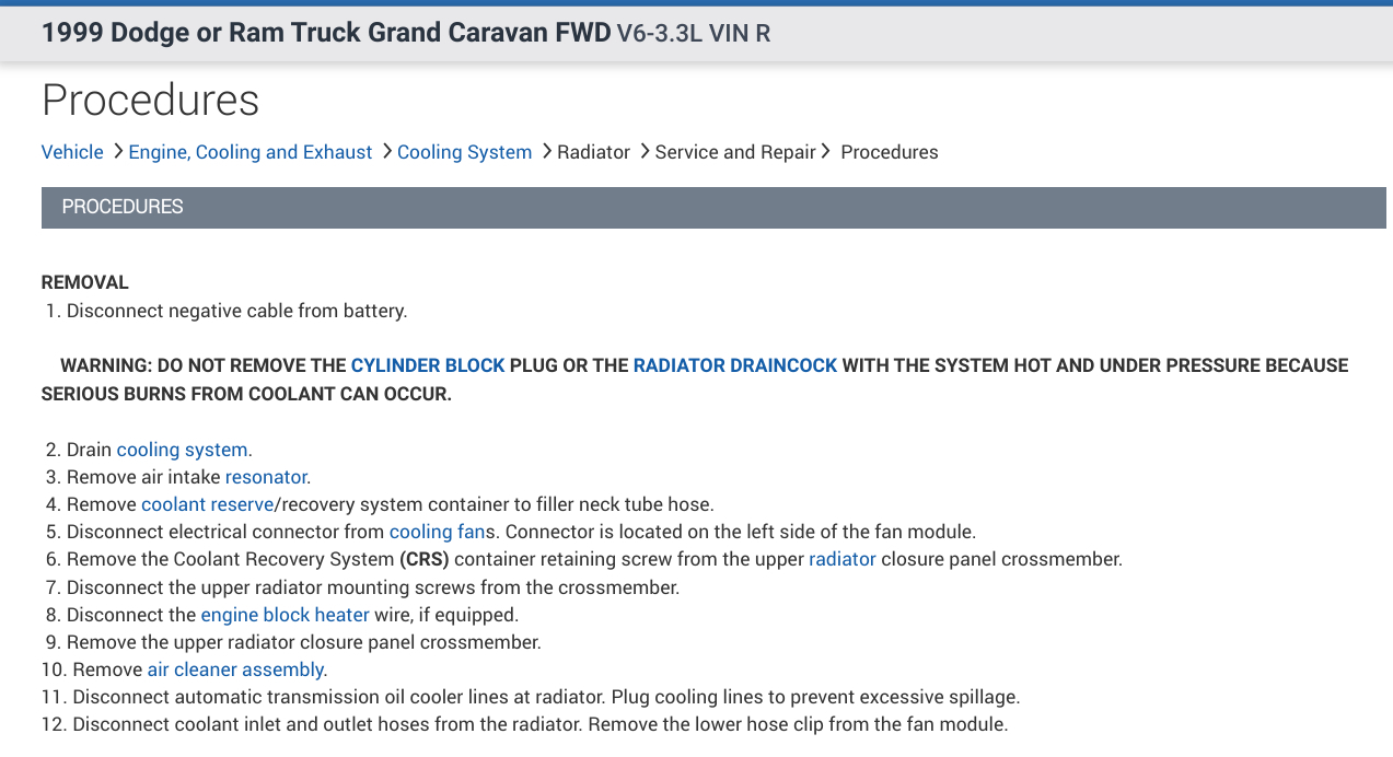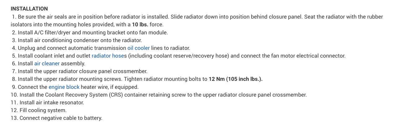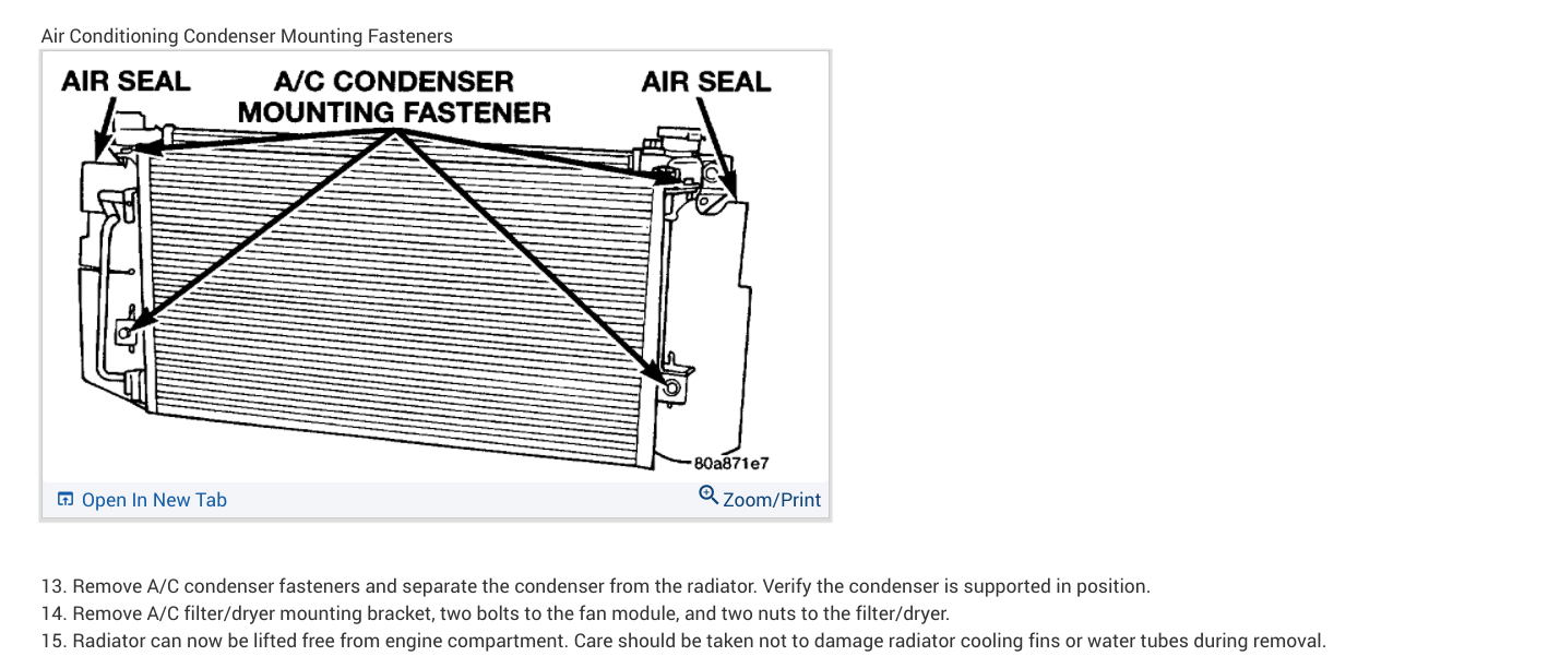In the diagrams down below I have included the Original Equipment Manufacturer[OEM] part number for your vehicle's radiator as well as the instructions for the removal and installation of the radiator for your vehicle. Please go through this guide and get back to us with how everything turns out. I hope that this helps.