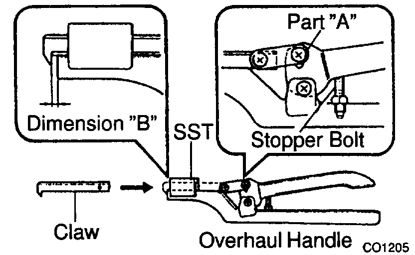 a. Install the claw to the overhaul handle, inserting it in the hole in part "A" as shown in the diagram.