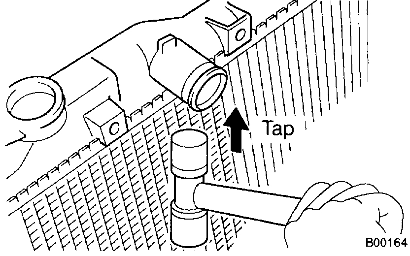 Lightly tap the bracket of the radiator (or radiator inlet or outlet) with a soft-faced hammer, and remove the tank and the O-ring.