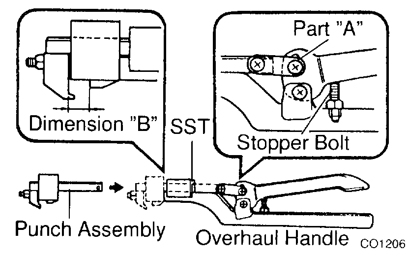 a. Install the punch assembly to the overhaul handle, inserting it in the hole in part "A" as shown in the illustration.