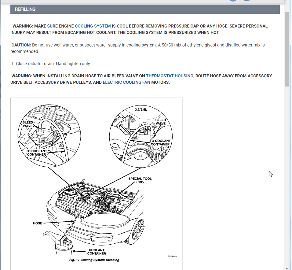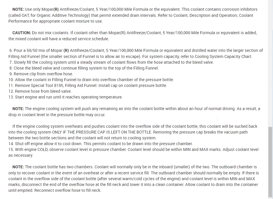 There are a number of ways to do it. I attached the info from the manual and a guide that will help in more general terms. However, you want to fill the radiator with as much as it will hold then let the engine warm up so the thermostat opens then it will pull it in from the radiator and you will want to keep the funnel full while it is filling the engine and hoses.