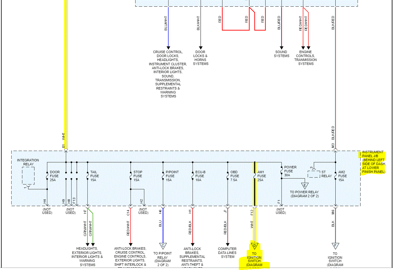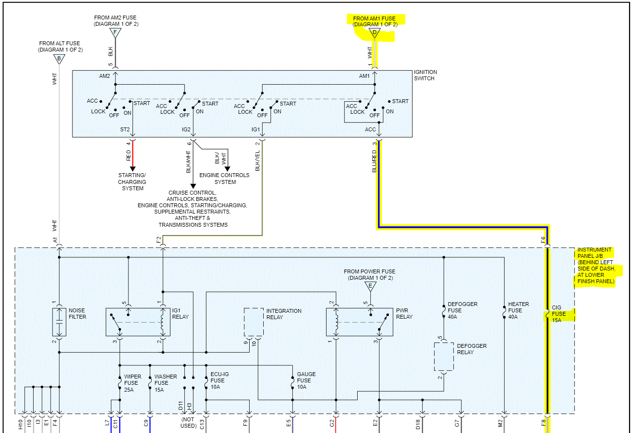 Here is what I need you to do. First, check the AM 1 fuse in the instrument panel fuse box. It is a 25-amp fuse that powers the 15 amp fuse you found to have no power. From there, power goes to the ignition switch and then back to the 15 amp fuse you replaced.