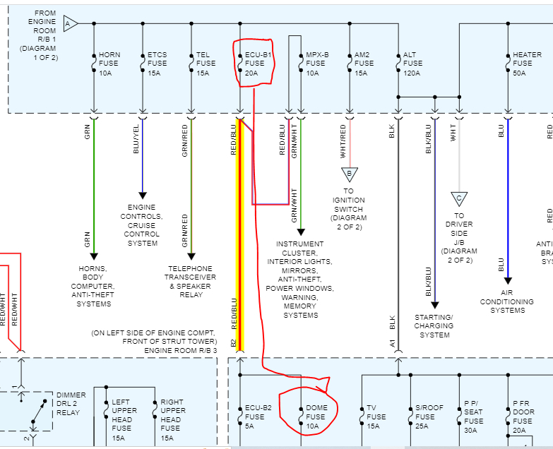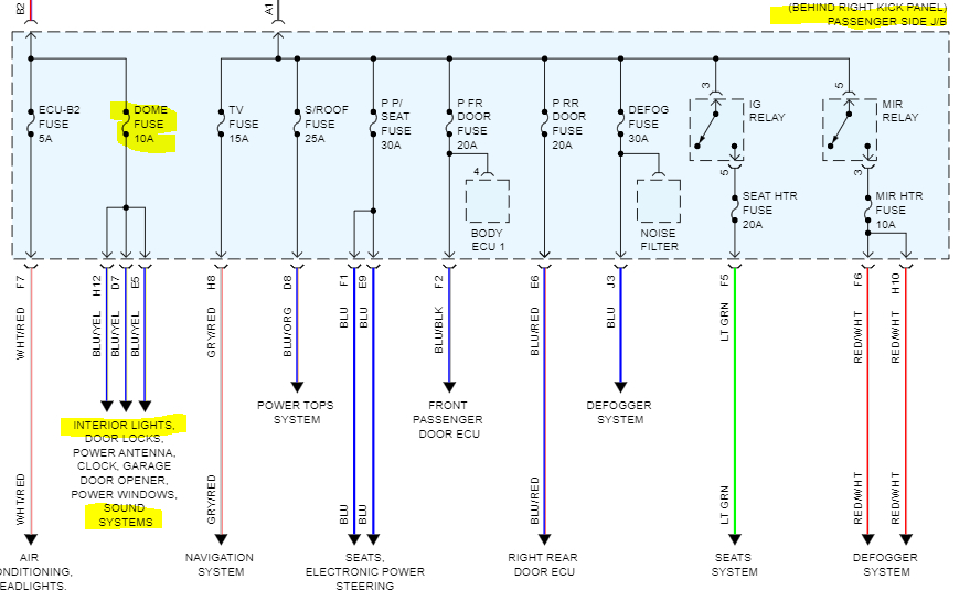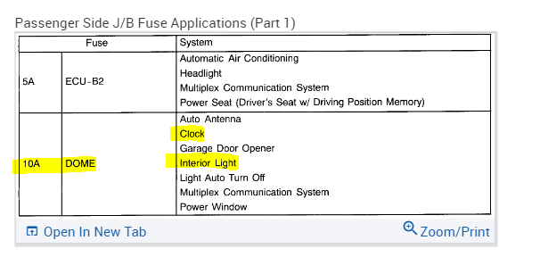 If the dome fuse in the passenger side fuse box has no power, open the hood and locate the ECU B1 fuse in the under-hood fuse box and check it as well. That is what powers to fuses you are dealing with. See pics below.