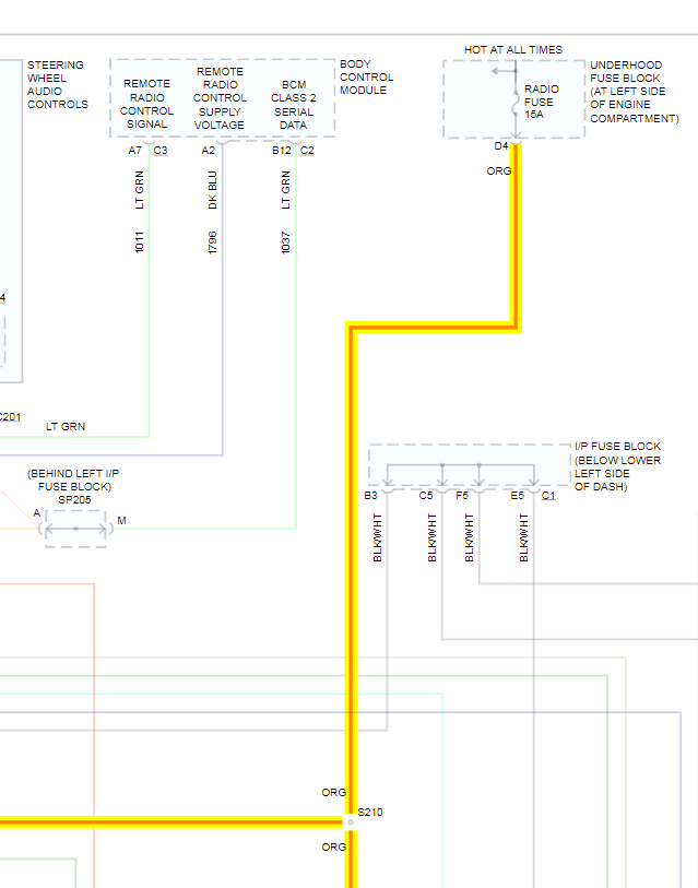 You have to appreciate that the engineers went through a lot of work to make their diagrams difficult to follow, then it gets worse when they get translated into online diagrams by another person. I found this one that shows all the places current could be going from your radio fuse, but instead of making separate diagrams for every version of optional equipment, they combined them all into one diagram, then you have to figure out what is relevant to the truck you're working on. I was going to use different colored arrows for each version, but as an experienced tv / vcr / car radio repairman, even I got confused with all the different options, and I had to give up.