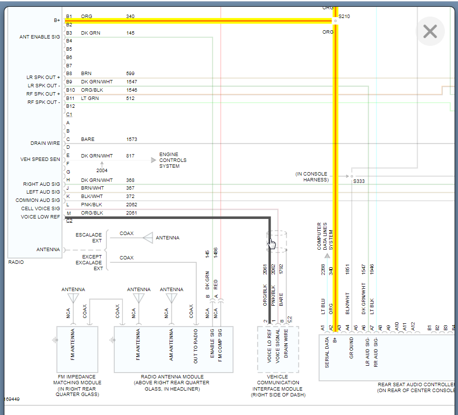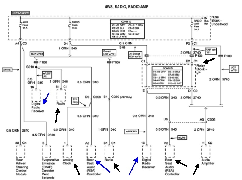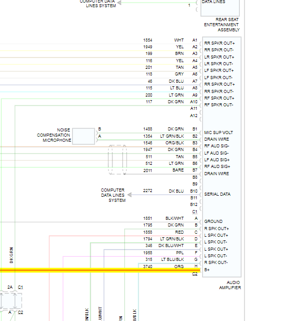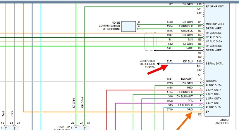 The last diagram is also from the aftermarket ones. They leave out a lot of things like splices and inline connectors, but they pack more information in one diagram. This is a partial diagram of the amplifier. I focused on that because you mentioned there was a related problem with that, but you didn't say what it took to solve it. This partial diagram is from the, "Premium Sound Radio Circuit (W/ Digital Radio Receiver)".