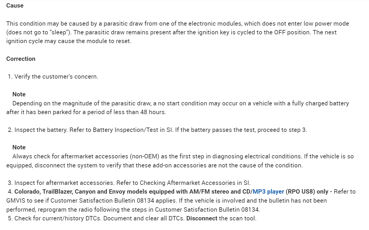 But either way, they have a procedure for checking the battery draw on the radio if it is the OEM original equipment. If it is aftermarket, it can still be another module in the vehicle waking the radio up at certain time intervals and causing a drain on the battery overnight.