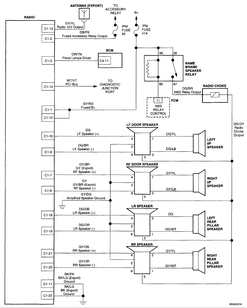 The dark green with gray stripe will be the battery positive line. Use a test light connected to a good ground to see if you have power to it. If you do not then check fuse 14. If it is okay test the speaker relay in the power module next to that fuse. (just swap it with one of the others with the same number of pins)