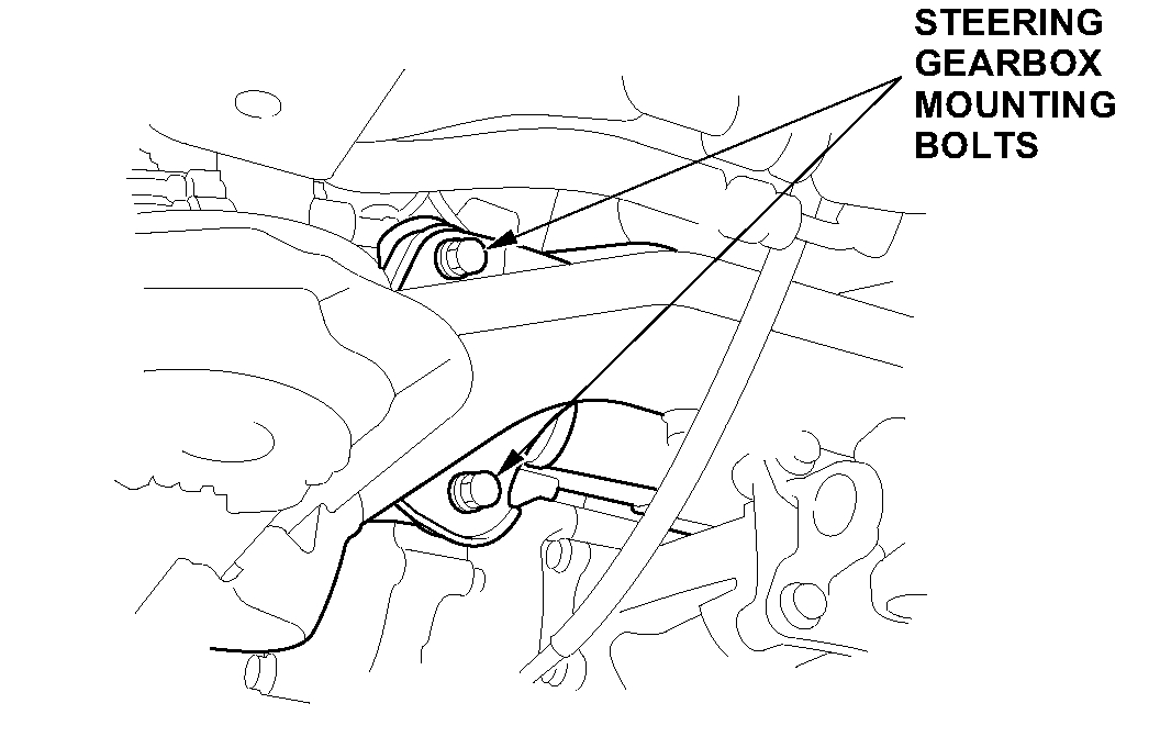 Replace the two steering gearbox mounting bolts in the pinion shaft area. Torque the new bolts to 58 N.m (43 ft-lb).