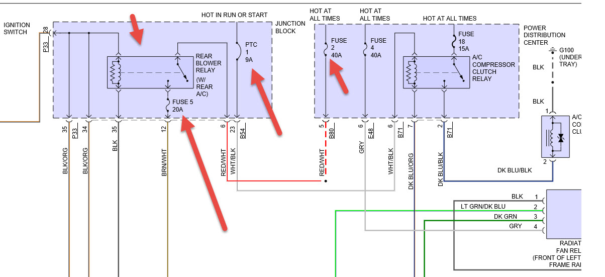 check fuses, circuit breaker and relay in picture these are power supply for rear blower motor. if rear motor does not get power or blows the fuse disconnect blower and see if it does it if not the motor is bad.