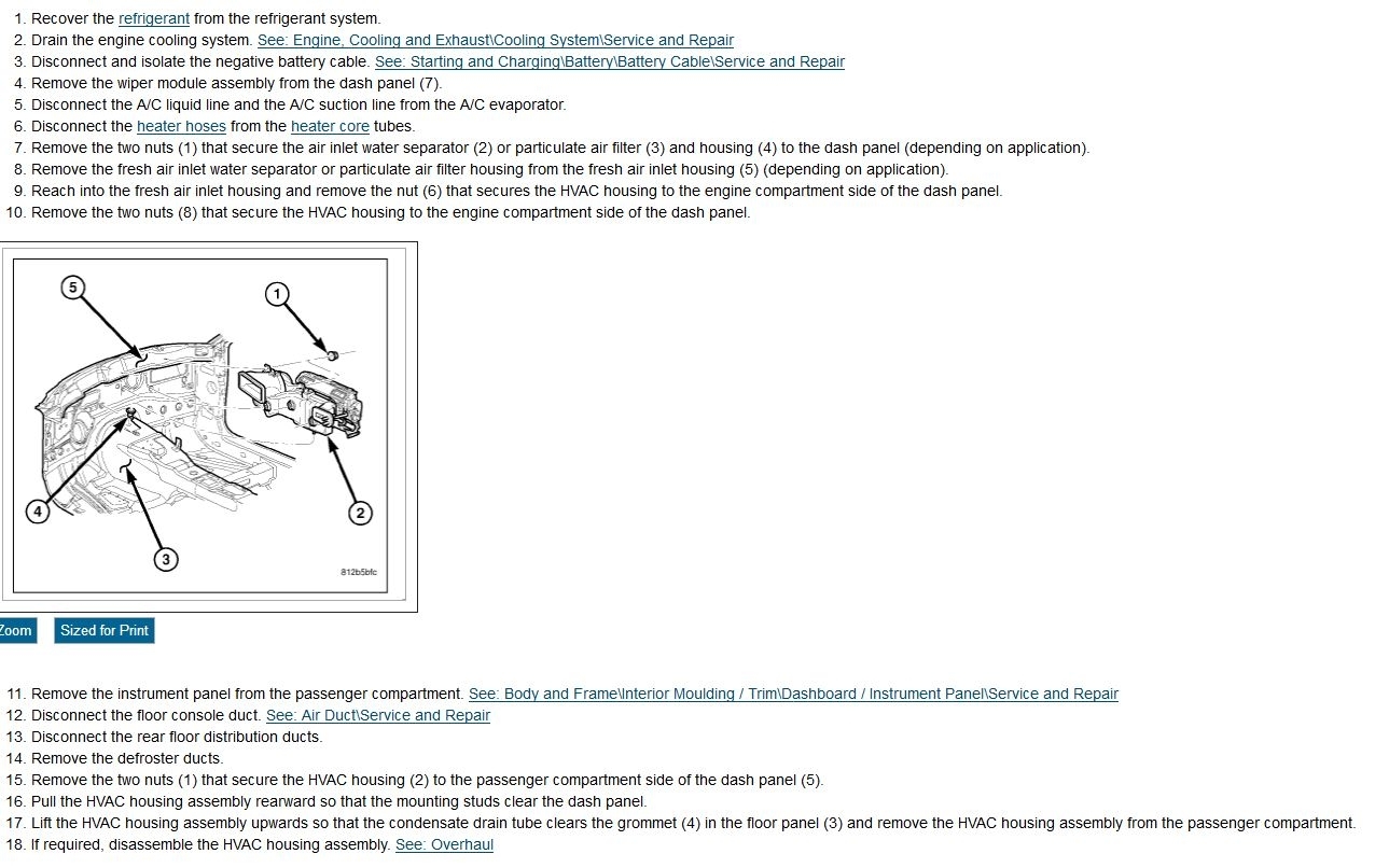 The air distribution housing must be removed from the HVAC housing and disassembled for service of the mode-air and blend-air doors. The air inlet housing must be removed from HVAC housing and disassembled for service of the recirculation-air door. The HVAC housing must be removed from the vehicle and disassembled for service of the A/C evaporator.
