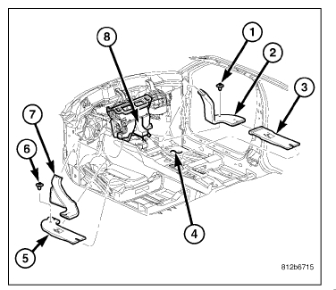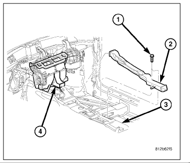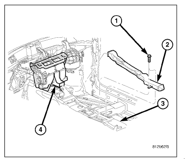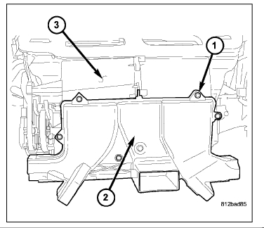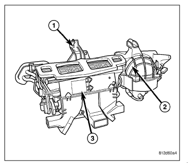 HVAC housing - The HVAC housing (1) is mounted to the dash panel behind the instrument panel and contains the A/C evaporator and the blower motor resistor or power model, depending on application. The HVAC housing consists of a upper and a lower housing that are attached together and has mounting provisions for the air inlet housing, blower motor, air distribution housing and the HVAC wire harness.