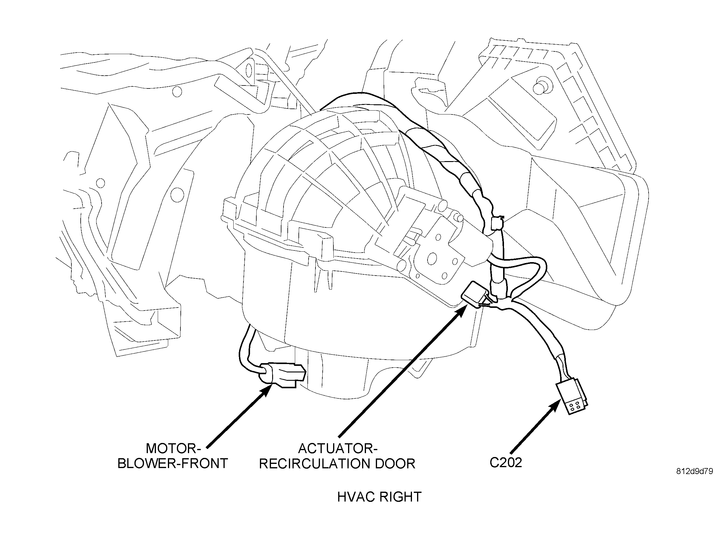 The A/C system is designed for the use of a non-CFC, R-134a refrigerant and uses an A/C evaporator to cool and dehumidify the incoming air prior to blending it with the heated air. A temperature control determines the discharge air temperature by operating the blend door actuator(s), which moves the blend-air door(s). This allows an almost immediate control of the output air temperature of the system. The mode door actuator operates the mode-air doors which direct the flow of the conditioned air out the various air outlets, depending on the mode selected. The recirculation door actuator operates the recirculation-air door which closes off the fresh air intake and recirculates the air already inside the vehicle. The electric door actuators are connected to the vehicle electrical system by the HVAC wire harness. The blower motor controls the velocity of air flowing through the HVAC housing assembly by spinning the blower wheel within the HVAC housing at the selected speed by use of the blower motor resistor or power model, depending on application.