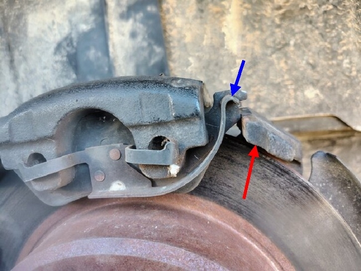 More likely you removed a cast aluminum wheel and installed a spare that's a different steel wheel. Unless there's something I'm not seeing, this didn't just start with the spare tire. That caliper can't lift up unless the one mounting bolt is missing or mispositioned. Try to pry that end up more with a flat-blade screwdriver. If you see any movement, it proves that bolt isn't doing its job.