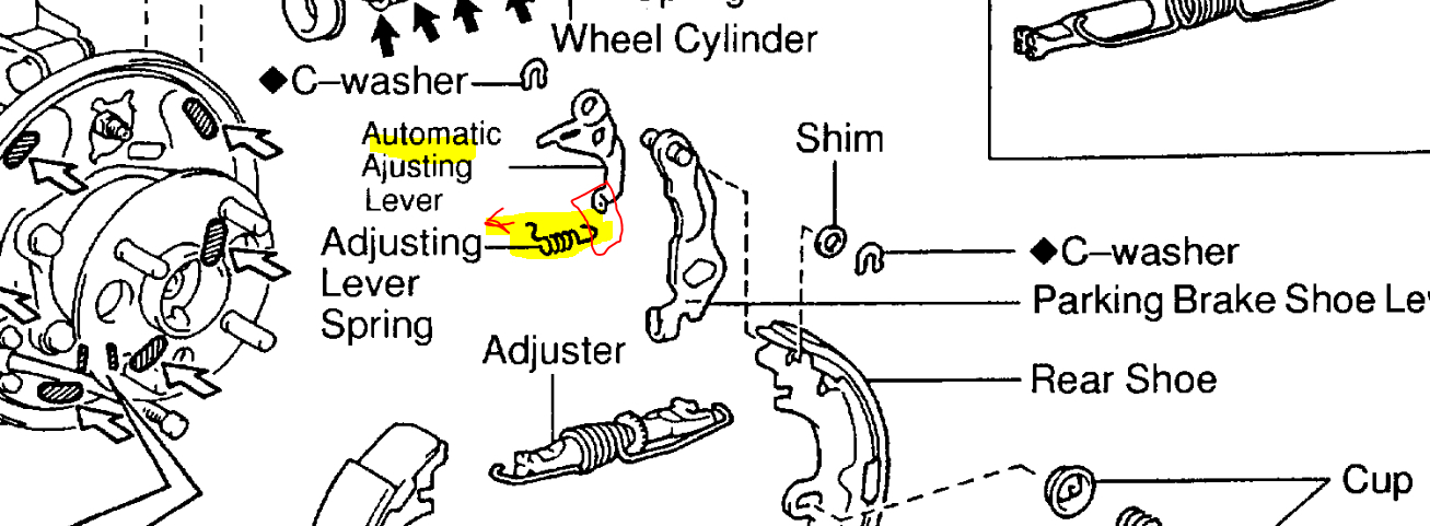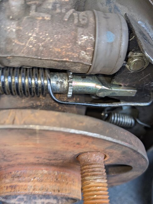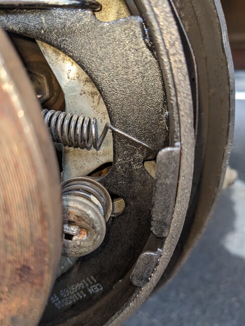 After much toil, hammering, and trouble, I got it done. But there are 2 burning questions. 1) each side has a spring on it that runs to the rear shoe from a piece of hardware. Not one of the springs that holds the shoes together and not the spring clip. It has a double hook on one side and a regular hook on the shoe side. I can't remember how that egoes for sure. I've got it in place where it's not coming out, but it doesn't "feel right." I'm thinking it has become too stretched to go into the holes that it's supposed to go into.