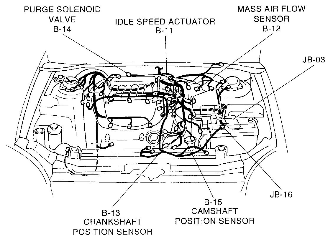 Ensure timing marks are aligned. Ensure center of span on tension side of timing belt "B" can be depressed by hand. Ensure belt deflection is .20-.30" (5-7 mm).