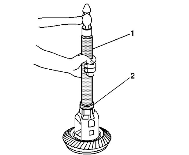 2. Install the J 44420 (2) and the J 8092 (1) onto the differential case bearing as shown.