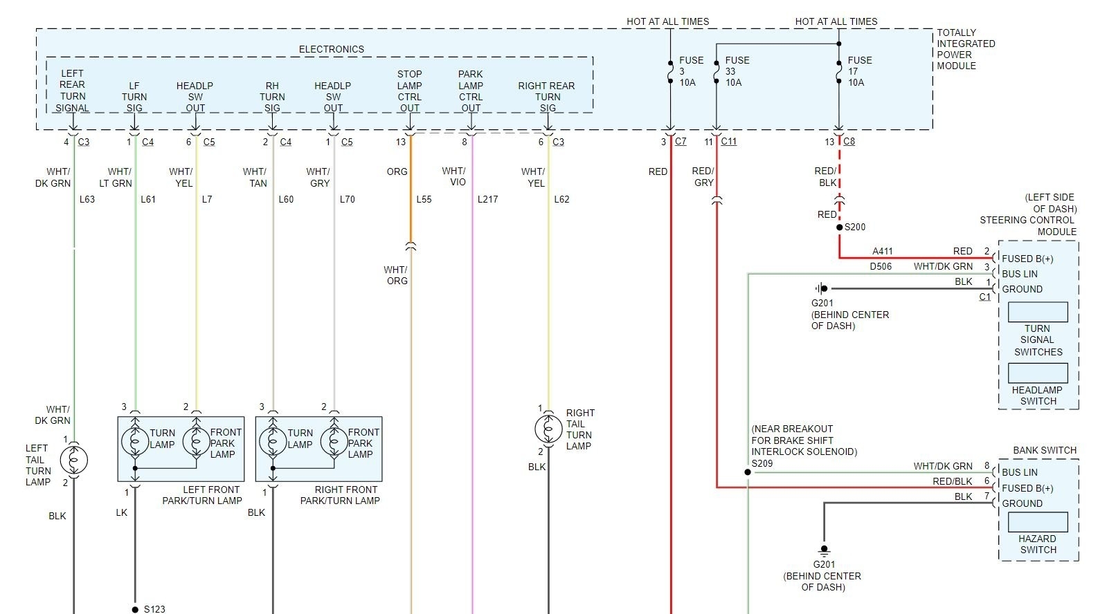 Okay, you say the hazards do work on both sides? IE the same lamp that isn't working as a turn signal does work as a hazard light? Just want to be sure as that indicates the likely issue is in the turn signal switch itself as the rest of the circuits share components and power. The turn signal switch sends a signal to the integrated power module to turn on the right and left turn signals as requested while the hazard switch sends a signal to turn on all of them at once, so if the hazard works on that lamp but not the turn signal then the wiring should be OK as well as the TIPM, That leads back to the switch itself.