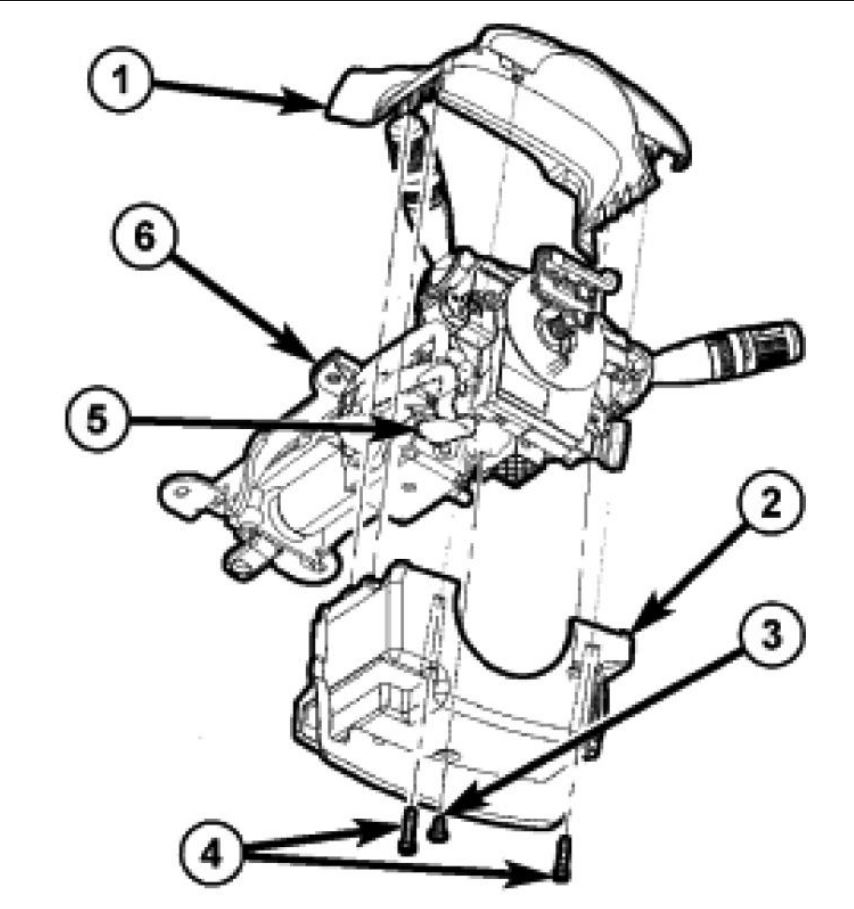 To replace the switch you need to disconnect the negative battery cable then remove the upper and lower plastic covers from the steering column. To do that tilt the steering down and leave the lever down. Next remove the screws that secure the upper and lower covers (items 3 and 4) then gently press and release the clips that hold the two pieces together. Then remove the upper then lower covers.