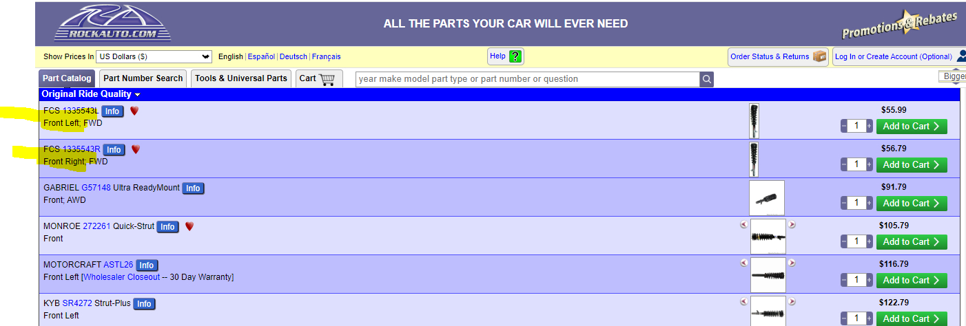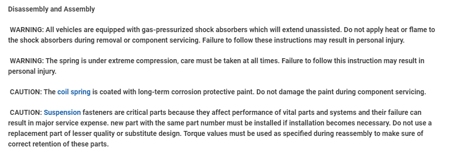 Next, here is what I'm going to recommend. To avoid possible injury and to make your life a lot easier, you can get the entire strut assembly on rockauto.com for under 60.00 each. The shocks and coils will be much more individual. I attached pics below. If you get those, everything is together and all you need to do is unbolt the old and install the new. Otherwise, you will need to dismantle the strut assembly.