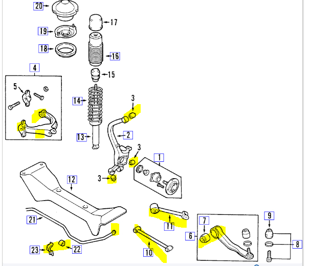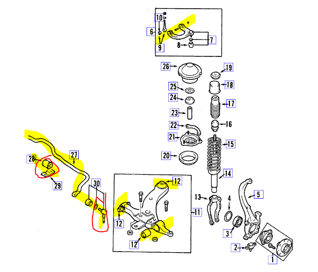 If you look below, I attached two pics. One is an exploded view of the front suspension and the other is the rear. I highlighted things to check that can cause a sway. Keep in mind, weak or faulty shocks can do that as well.