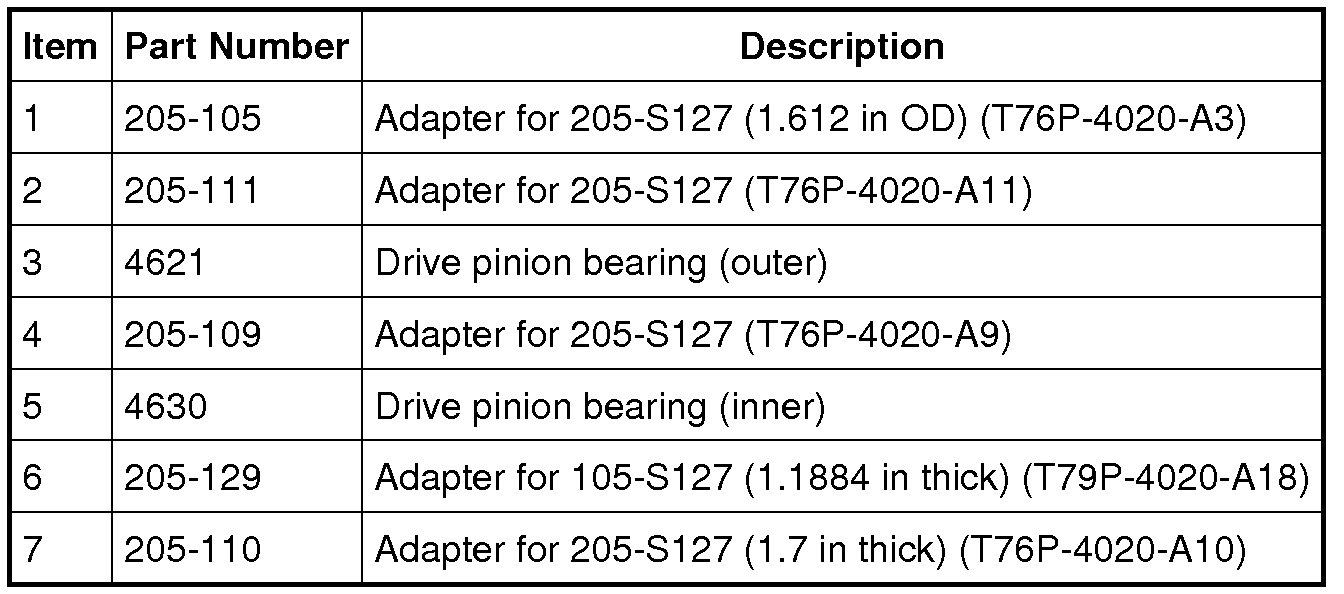 - After the correct drive pinion bearing adjustment shim thickness has been determined, remove all of the Adapters.