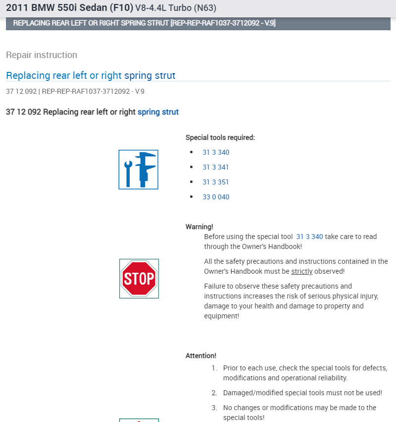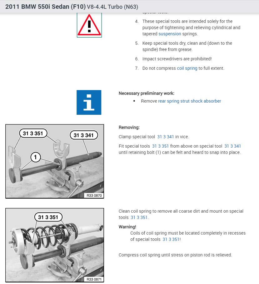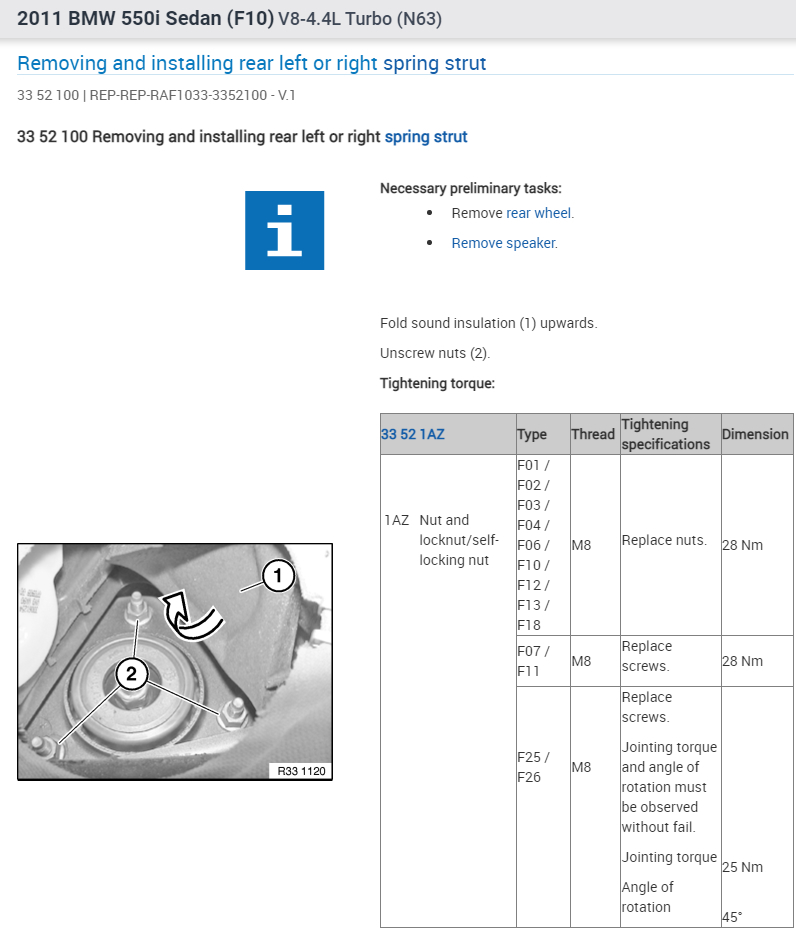 Can you please provide the work process details to remove and replace the rear strut shock absorbers, associated wear out components, including torque specifications and pro tips?