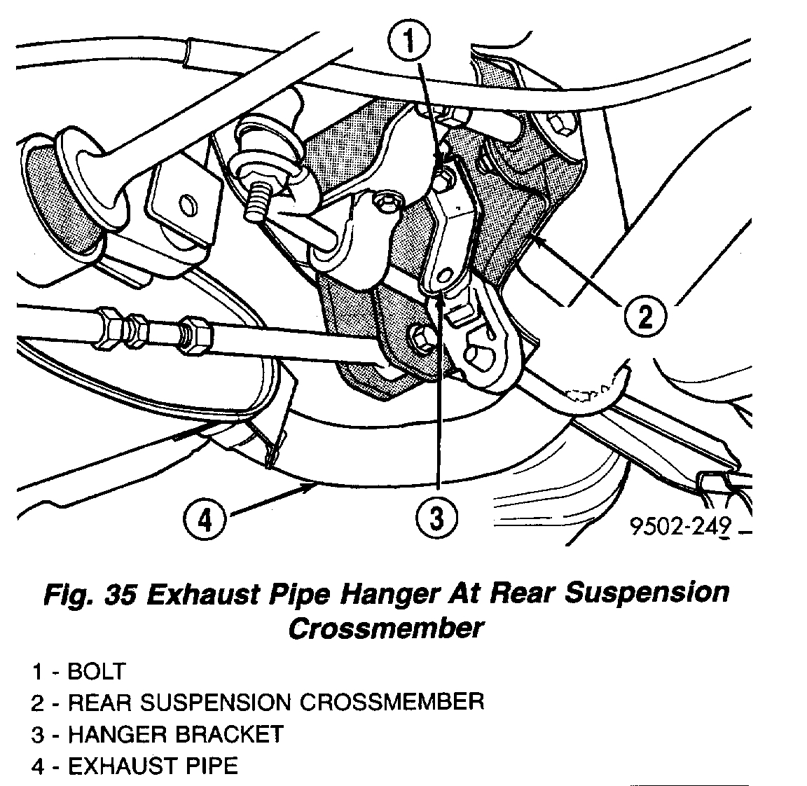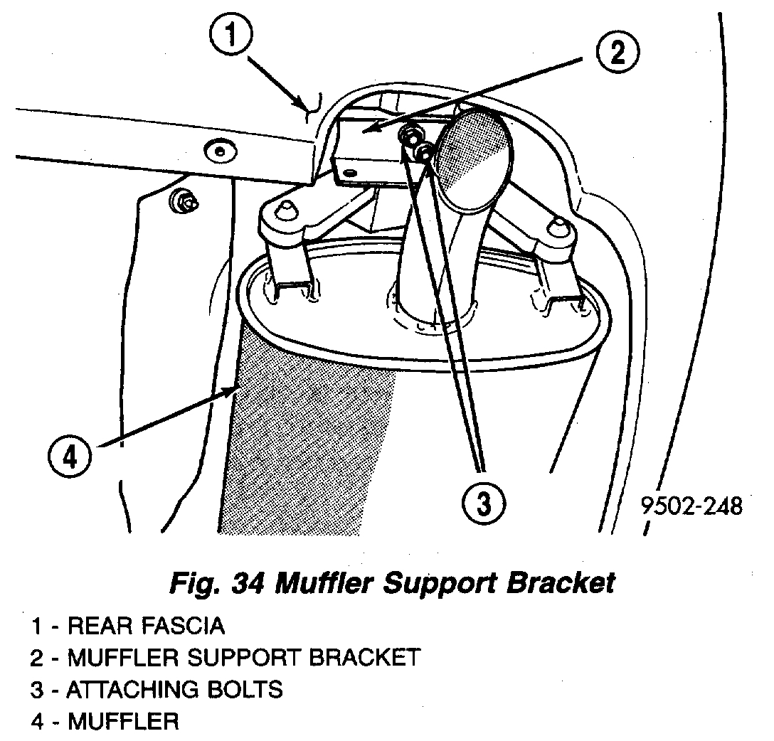 6. Install muffler support bracket on rear frame rail. Install rear exhaust pipe hanger on rear suspension crossmember.