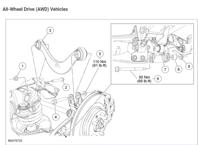 To install, tighten the new bolt and flagnut to 90 Nm (66 lb-ft), All-Wheel Drive (AWD) vehicles.