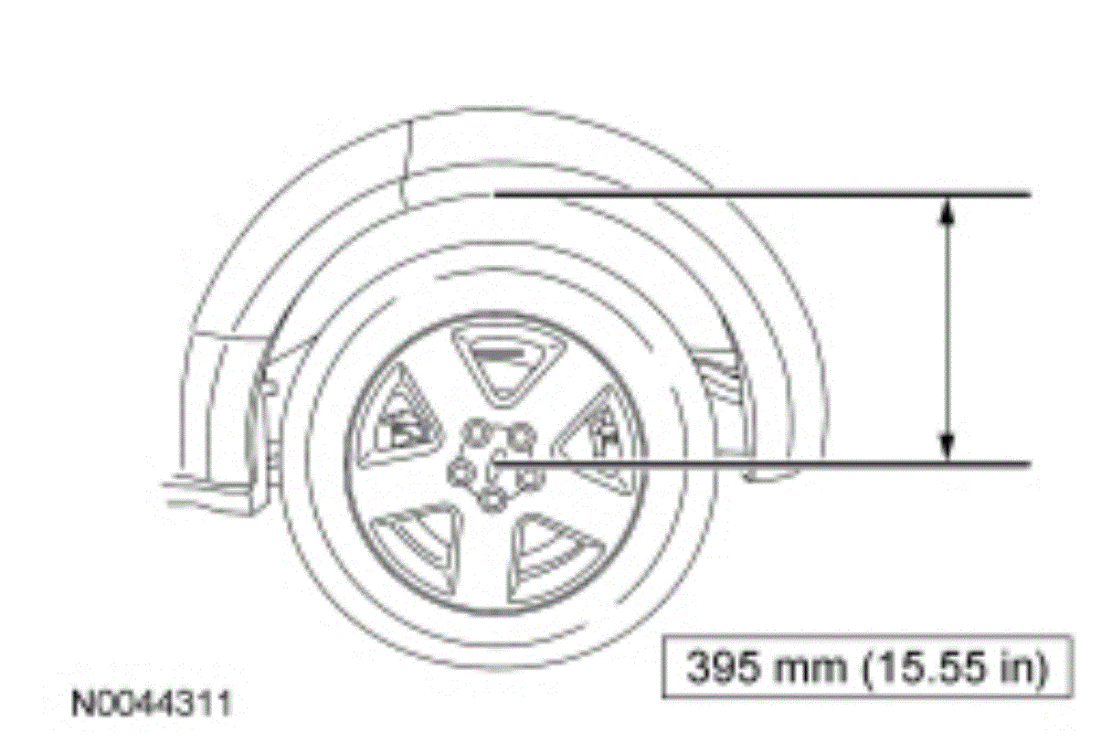 NOTICE: Before tightening any suspension bushing fasteners, the suspension must be at the bushing fastener tightening position. Use a suitable jack to raise the suspension until the distance between the center of the hub and the lip of the fender is equal to 395 mm (15.55 in). This will prevent incorrect clamp load and bushing damage.