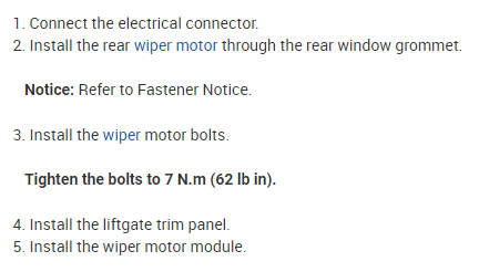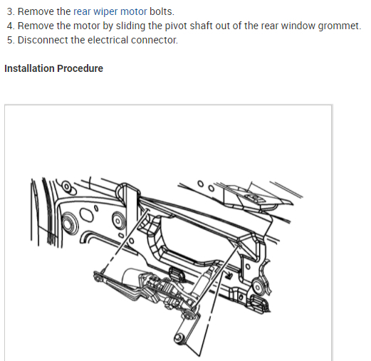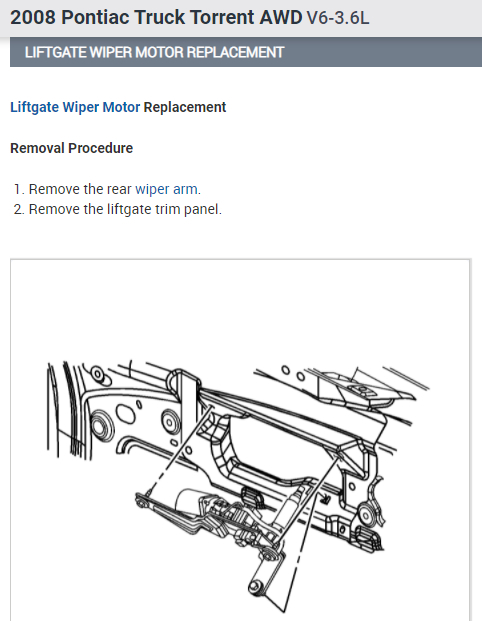 I've attached picture steps below on how to replace the rear wiper motor on your Torrent. I've also attached the rear wiper motor wiring diagram below and cut it into 3 pieces so you can view larger. Hope this helps and thanks for using 2CarPros.