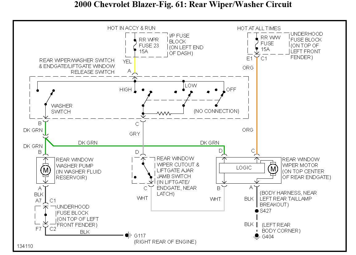 When the ignition is turned on the rear wiper engages just long enough to move the arm up an inch or so which blocks the rear window glass from opening. Have to turn on the rear wiper to reset the arm back down. This may have started after replacing front washer reservoir motor, but not positive.